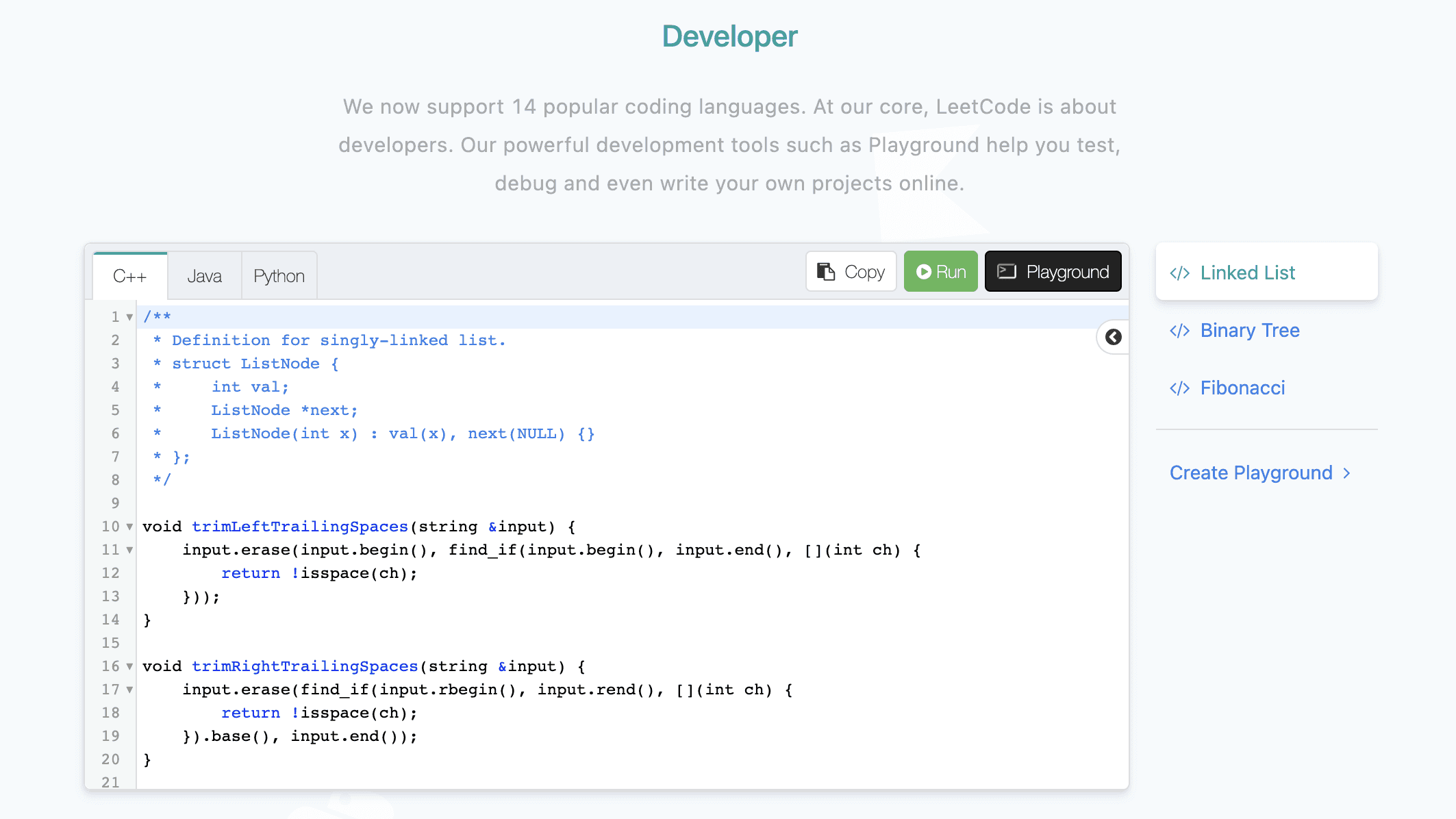 Платформа поддерживает 14 популярных языков программирования.